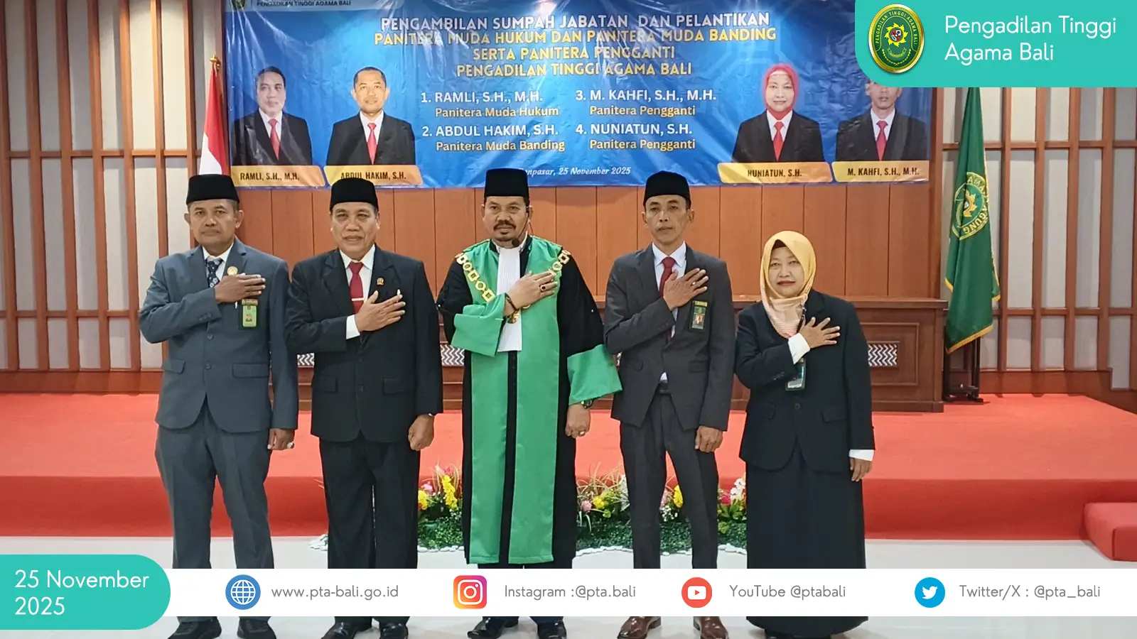 Selasa, 25 November 2025 – Pengadilan Tinggi Agama (PTA) Bali menyelenggarakan kegiatan Pengambilan Sumpah Jabatan dan Pelantikan tenaga teknis bertempat di Aula PTA Bali. Acara berlangsung khidmat dan dipimpin langsung oleh Pimpinan Pengadilan Tinggi Agama Bali dengan dihadiri para pejabat, aparatur PTA Bali, serta tamu undangan lainnya.